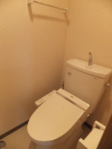 | 従来型の水洗トイレでした。写真ではわかりませんが、床がきしんでおり、不安定な状態でした。 | 床を補修し、最新型の節水型トイレに取り換えました。もちろんウォシュレット付です。 |